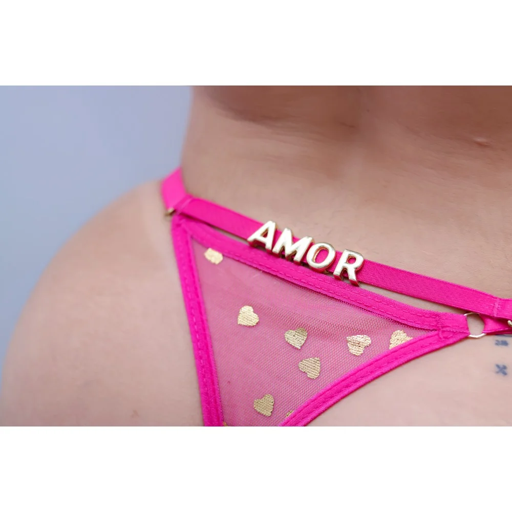 A parte frontal é de tule com transparência e a parte de trás é fio dental com uma tira personalizável que permite a colocação de letras e aplicações para montar frases sugestivas como: “Me Come”; “Me Fode”; “Te Amo” …. ou nomes da sua preferência e surpreender seu amor.