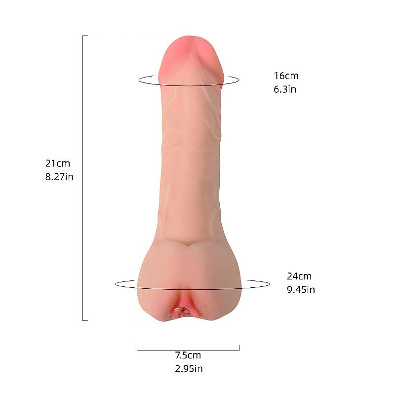 Masturbador em formato de pênis feito TPE com vagina – material macio de toque aveludado que imita perfeitamente a textura da pele humana.